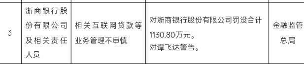 9月5日,国家金融监督管理总局行政处罚信息公示列表显示,浙商银行因相关互联网贷款等业务管理不审慎被罚没合计1130.80万元,谭某被警告。