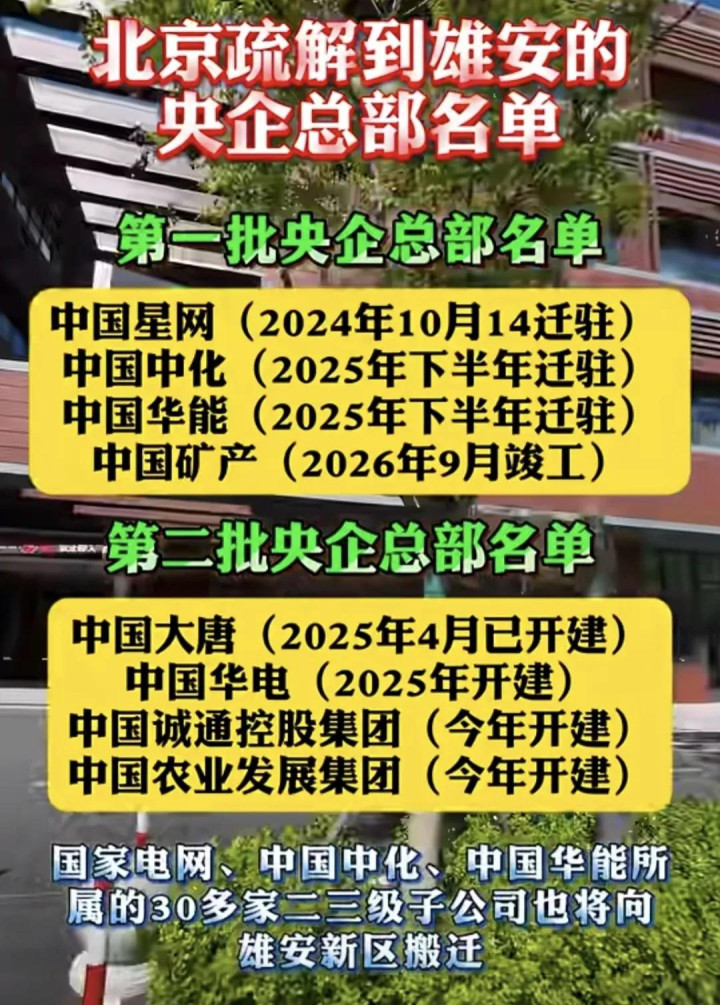 2023年5月12日,深入推进京津冀协同发展座谈会提出,要着力抓好标志性项目向外疏解,接续谋划第二批启动疏解的在京央企总部及二、三级子公司或创新业务板块等。会议之后,北京市、国务院国资委、河北省和雄安新区等均进行了相应部署和表态。其中,国资委表示,督促指导落户雄安新区的有关中央企业加快推进总部大楼建设,积极推动人员落户和产业导入等工作。