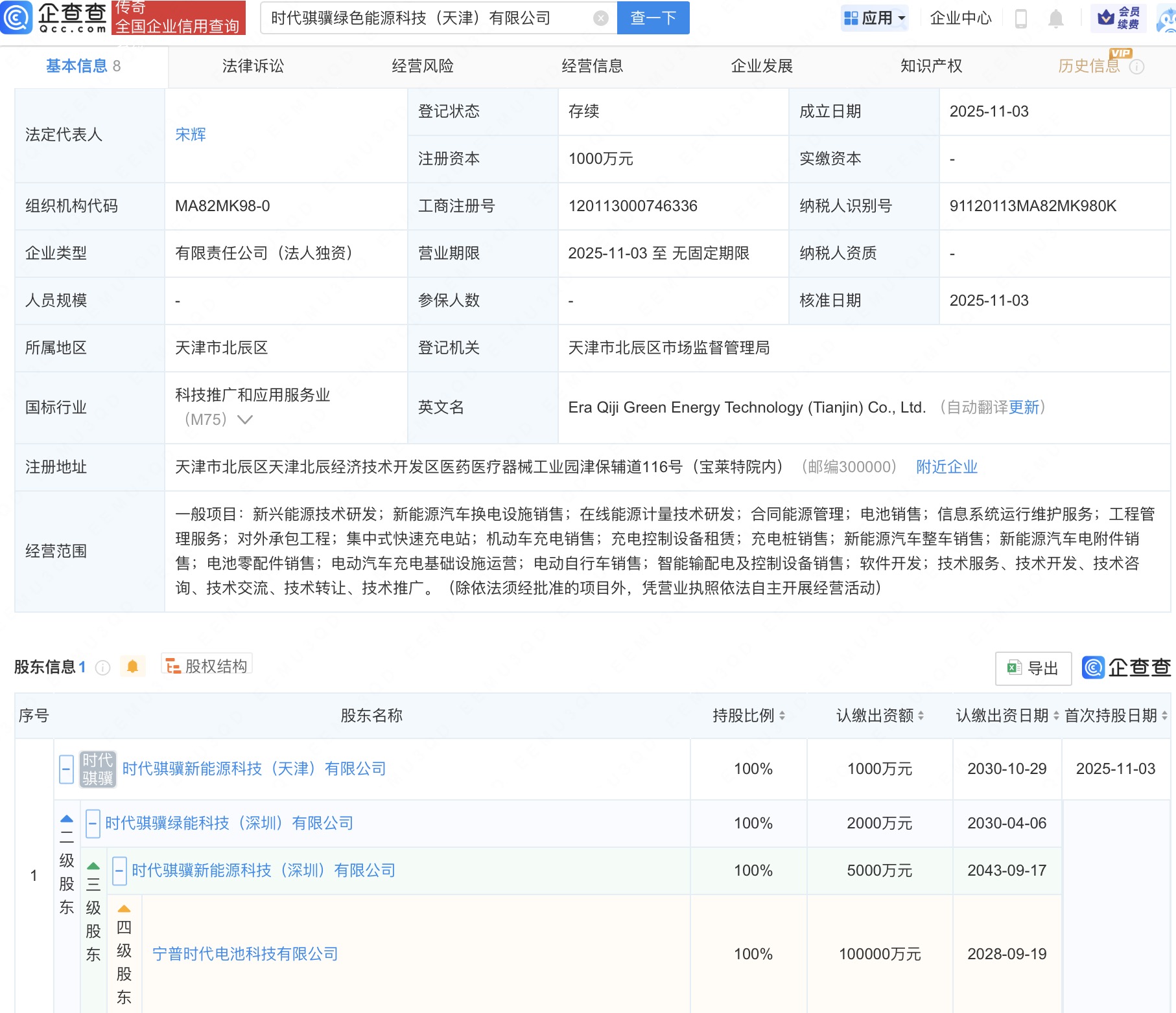 近日深圳炒股杠杆论坛 ,时代骐骥绿色能源科技(天津)有限公司成立,法定代表人为宋辉,注册资本1000万人民币,经营范围包括新兴能源技术研发、新能源汽车换电设施销售、在线能源计量技术研发、合同能源管理等。企查查股权穿透显示,该公司由宁德时代(300750)旗下时代骐骥新能源科技(天津)有限公司全资持股。