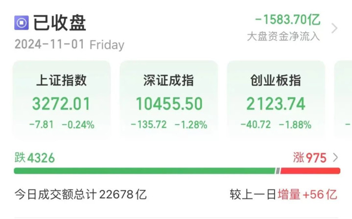 周五,A股三大指数冲高回落,创业板指较弱。截至收盘,上证指数报3272.01点,跌0.24%;深证成指报10455.50点,跌1.28%;创业板指报2123.74点,跌1.88%。
