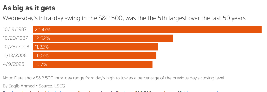 自4月2日远超市场预期的面向全球对等关税计划公布以来,美国股市接连创下多项纪录:周一标普500指数出现8.1%的史上最大规模单日波动之一,周二则上演至少50年来最剧烈的市场大反转之一,而周三标普500指数高达10.7%的振幅更是跻身近半世纪前五大波动日。